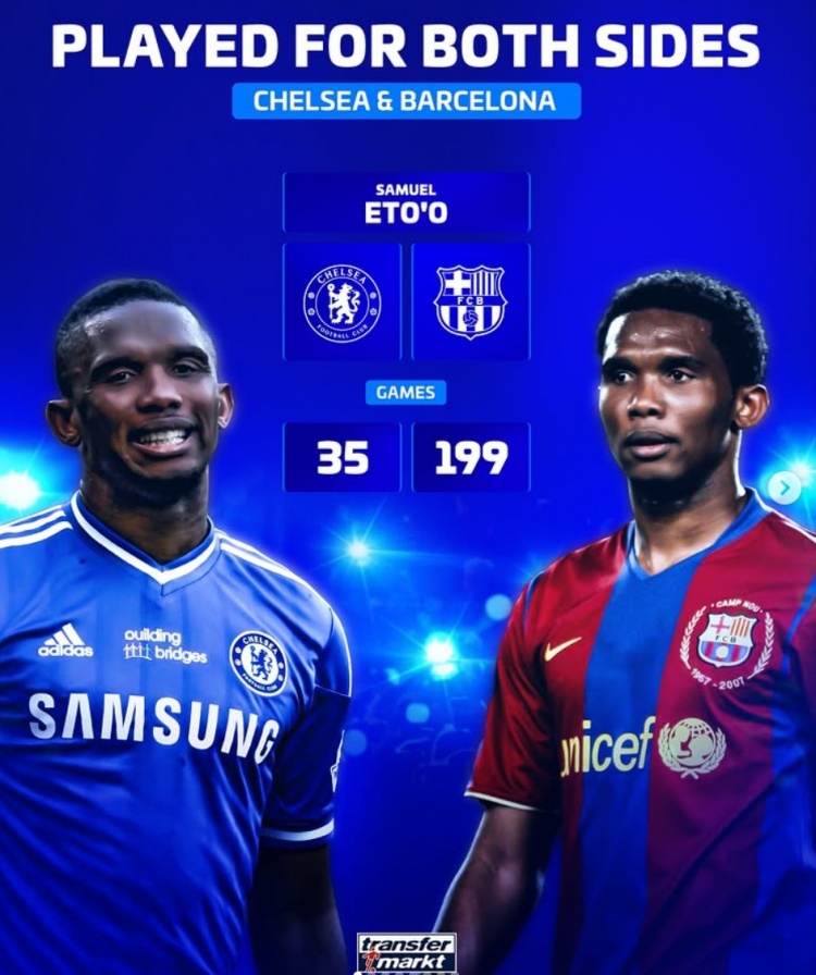 德转列切尔西巴萨双重履历球员:埃托奥、德科、小法、佩德罗在列